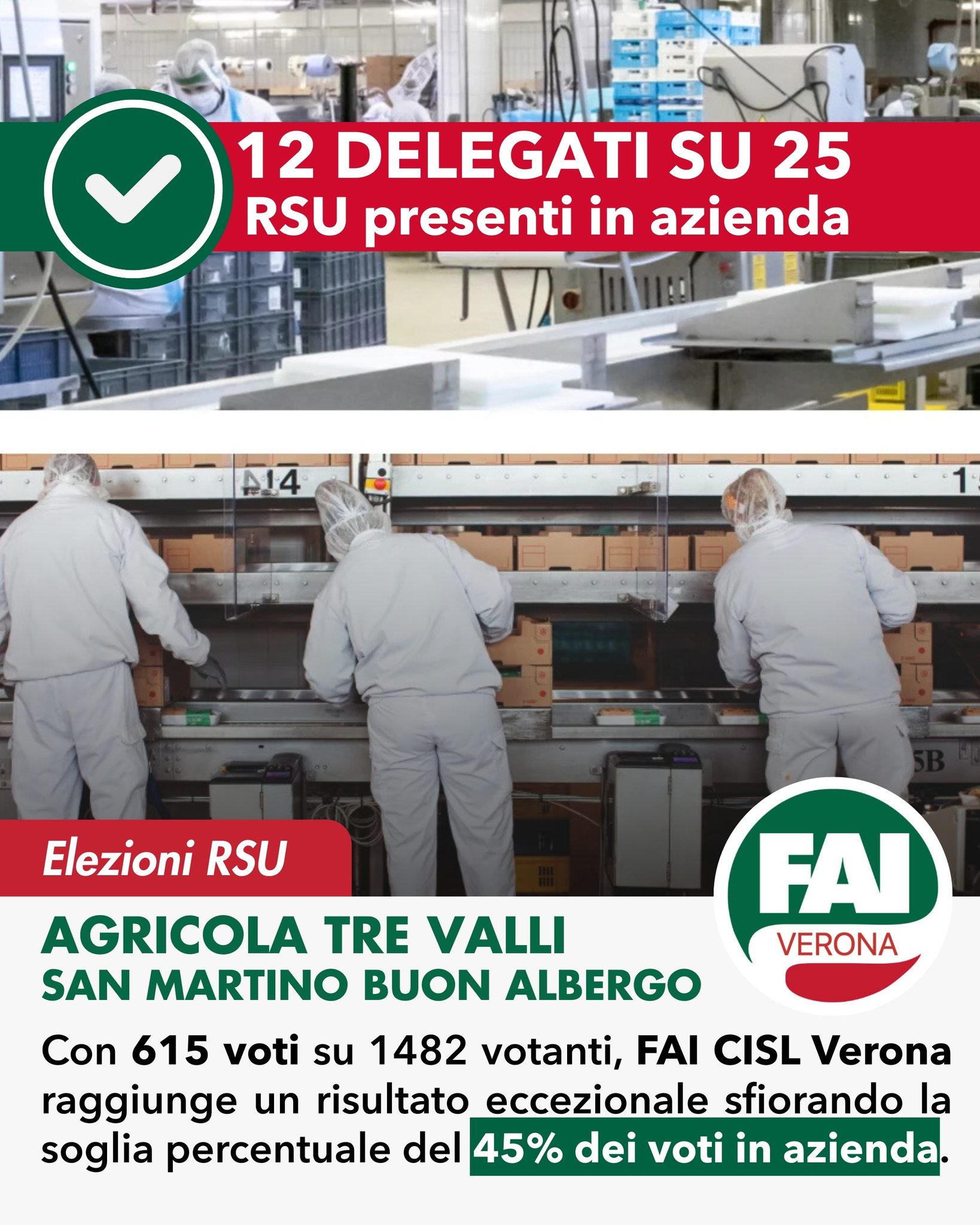 Con 12 delegati su 25 la Fai Cisl Verona conferma la propria leadership nell’azienda Agricola Tre Valli, realtà del gruppo Veronesi tra le più importanti a livello nazionale nel settore della trasformazione delle carni e delle uova. Nelle elezioni per le Rsu svolte nello stabilimento di San Martino Buon Albergo con una affluenza di 1482 votanti, la Federazione agroalimentare cislina ha conquistato 615 voti, quasi il 45% dei consensi.